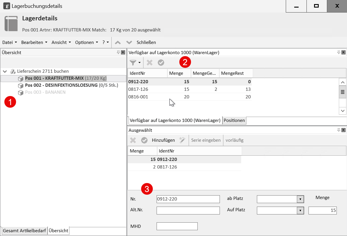 In diesem Dialogfenster können Sie alle fehlenden Details bequem aus einer Liste auswählen oder per Scanner einlesen. EULANDA zeigt Ihnen stets alle noch an Lager verfügbaren Identnummern an. Im Fall von Chargen ist es auch möglich, Teilmengen - sogenannte Splits - auszuwählen.