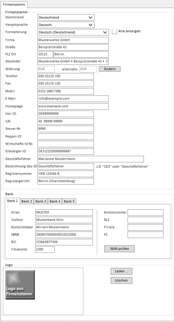 Über diesen Dialog verwalten Sie die zentralen Firmenstammdaten, wie Adresse, Telefonnummer oder Bankverbindung.